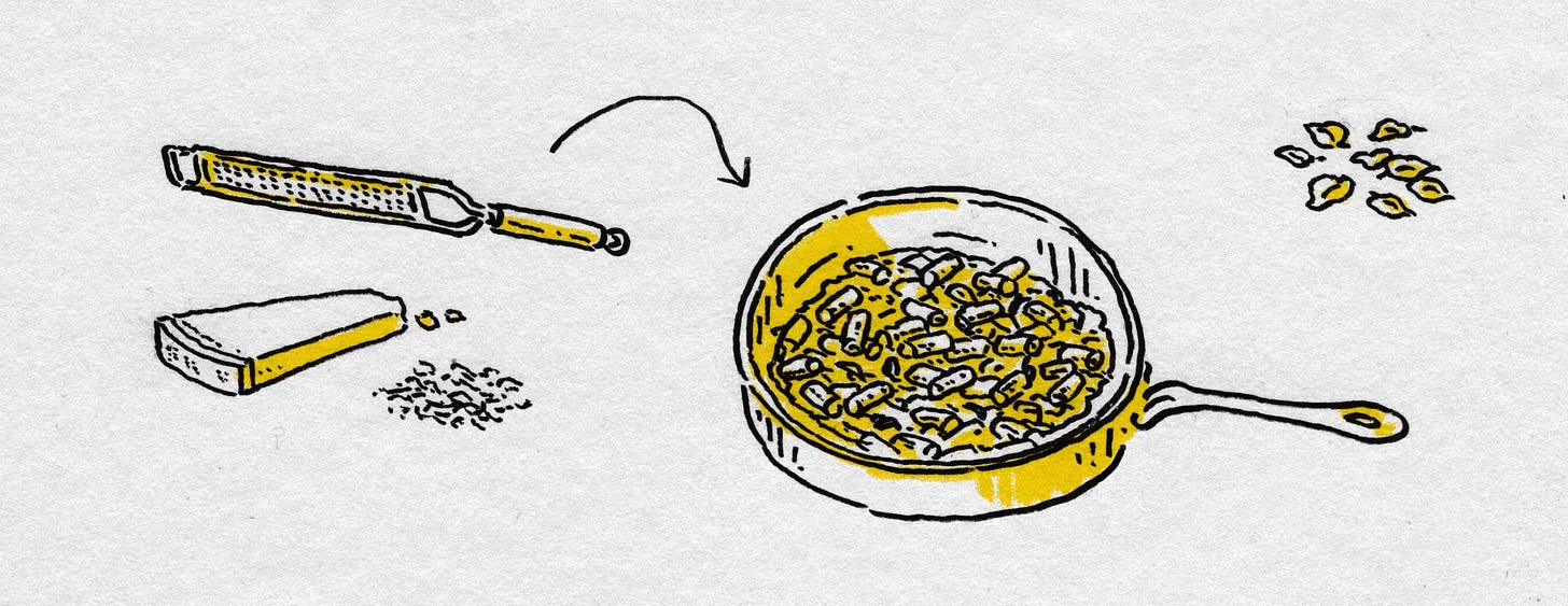 When the pasta is nearly cooked, add it to the frying pan, along with a glug or two of the pasta water. As it simmers, grate in a decent amount of parmesan, so it all comes together nicely.