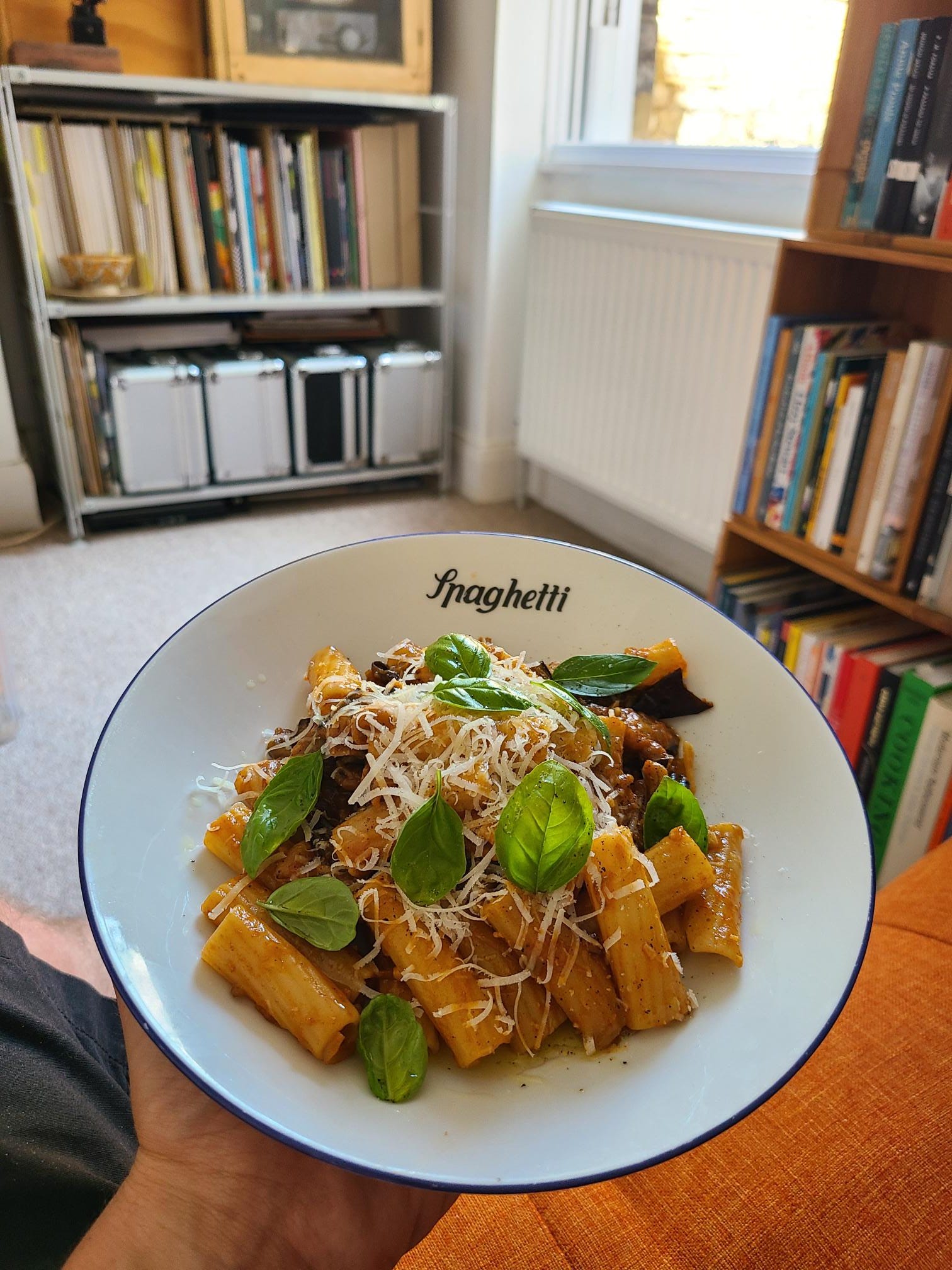 I recently wrote a newsletter on why I enjoy cooking, and a few of you asked why I didn’t include a recipe. This is probably out of my remit as an illustrator, but maybe as a kiosk proprietor I can just about shoehorn it in. So, here’s what I’m whipping up for lunch today; ‘aubergine pasta’.