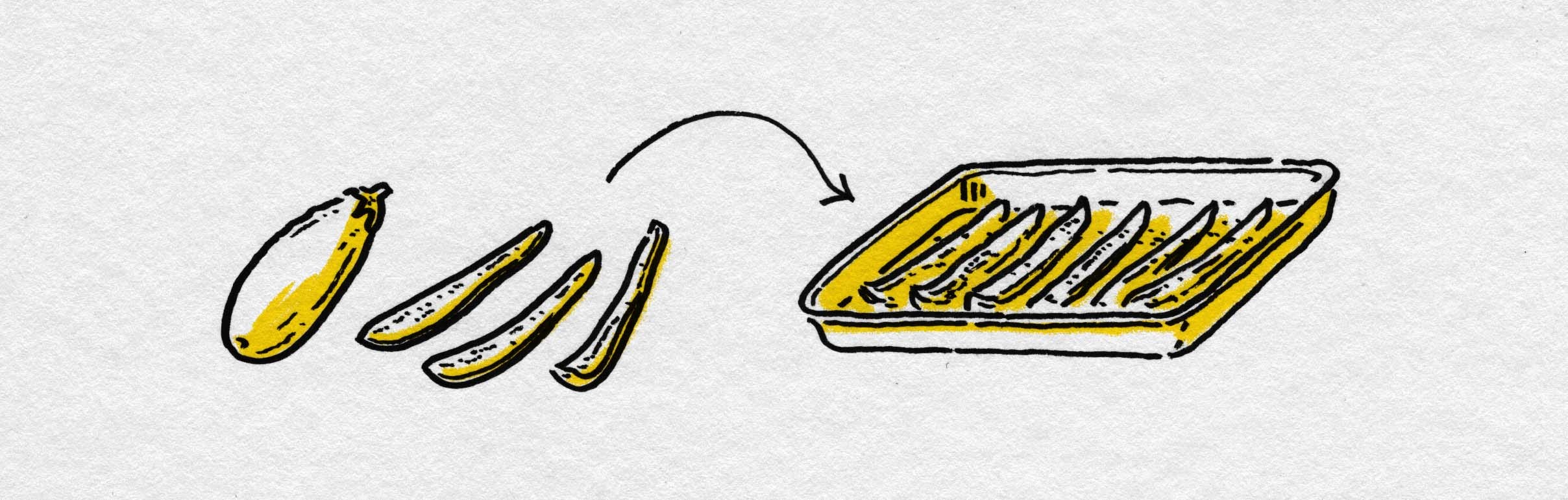 Slice up a couple of aubergines lengthways, lay in an oven tray and drizzle with olive oil. Season with salt and pepper, and put in the oven at about 200 degrees Celsius. About 30mins should do, but just check in on it.